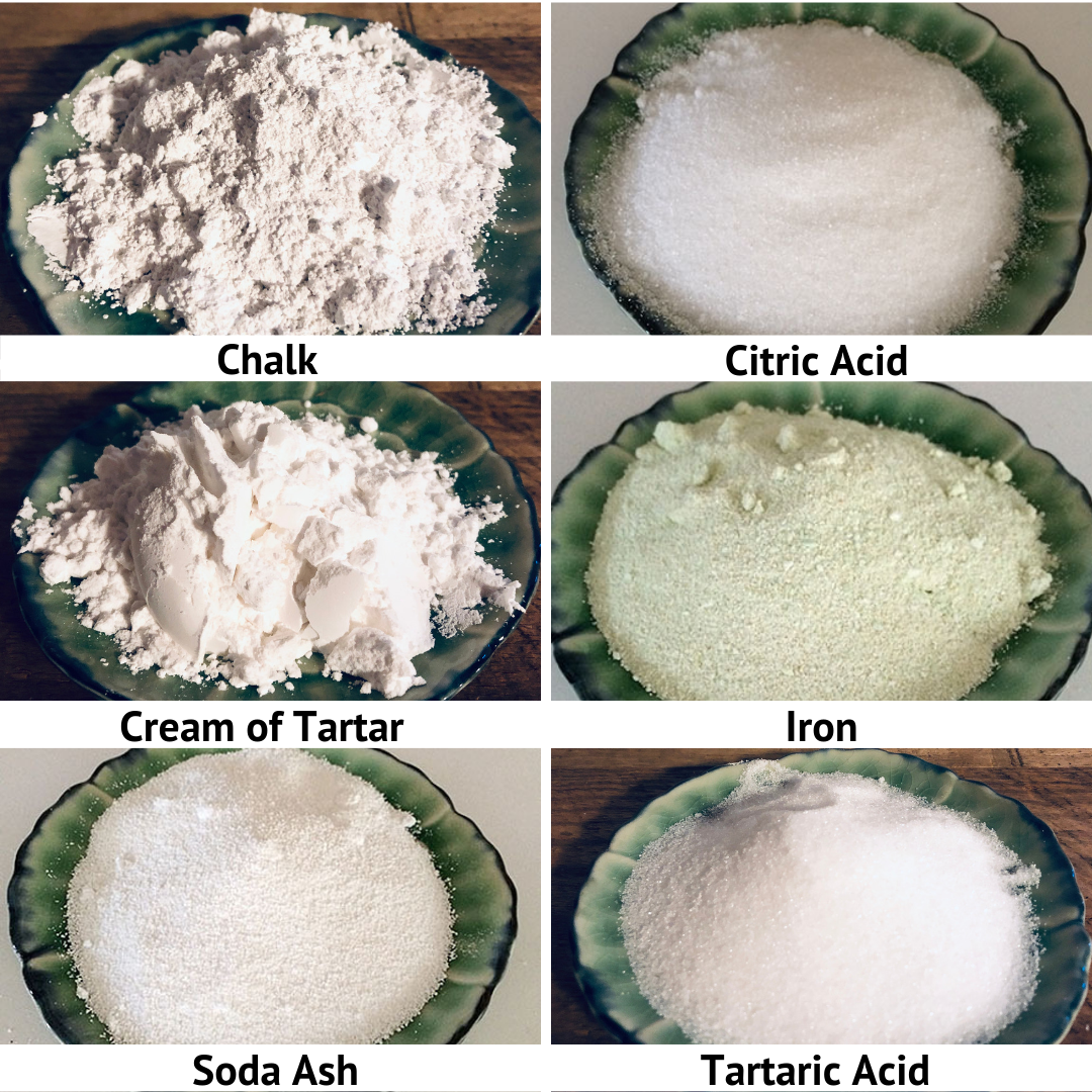 1-Chalk (Calcium Carbonate) – is used as a color changer. If you have “soft” water the addition of chalk to your dyebath will make your water “harder”. It is especially useful to make madder dye-baths redder.