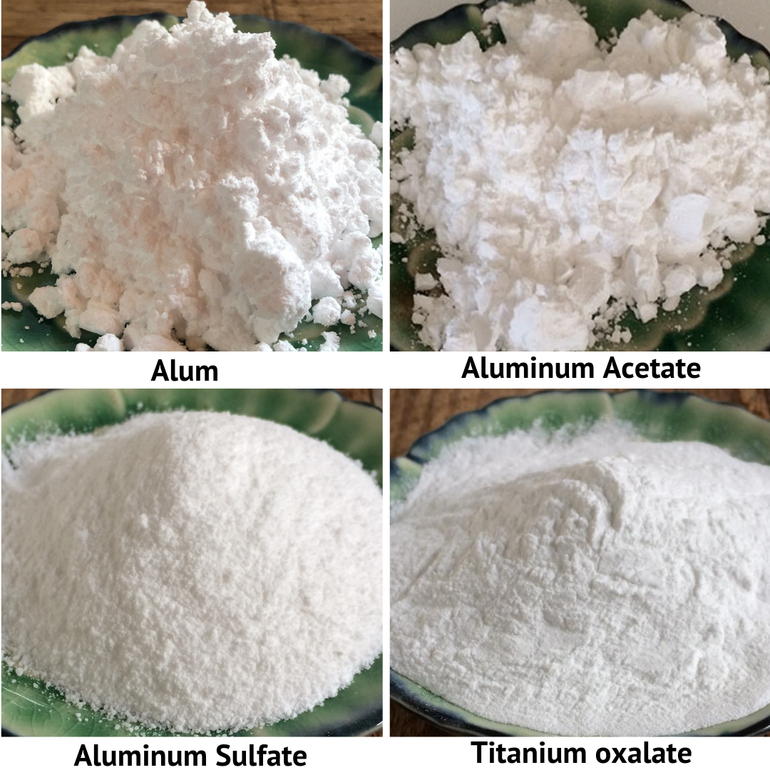 The word mordant comes from the French word “mordre” – to bite. The mordant combines with a natural dye and fixes the color to the material. Mordants make the color richer, lightfast and wash-fast. Using the right mordant is like cooking you would never substitute salt for sugar! The following 3 mordants are the refined state of Bauxite (the raw state of aluminum ore).